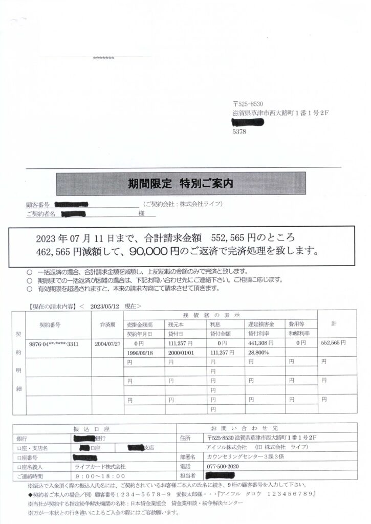 アイフルは似たような内容で「優遇処置のご案内」「減額和解のご提案」 などの書類も送ってきますので注意しましょう。