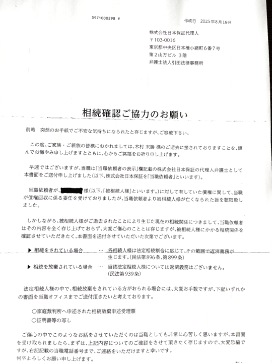 A 基本的には亡くなられた方の借金は法定相続人に相続されます。引田法律事務所が、債務者が亡くなったことを知った段階で、この通知を送ってきます。法定相続人を確認させてくれという内容です。