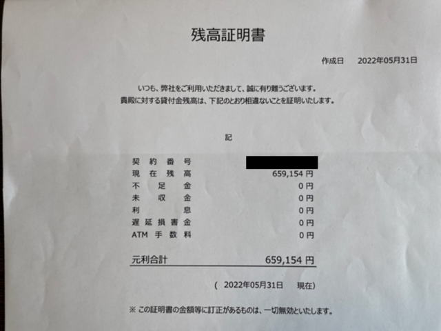 「残高証明書」の内容は、契約番号や残高などが書かれているだけで非常にシンプルです。なぜか利息・損害金の記載が無く元金のみの記載になっているケースが多い印象です。長期間放置されていることが多いので相当な利息が付いているはずですから、本当に元金のみの請求なのか疑った方が良いと思います。