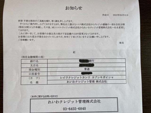 「お知らせ」の内容は、「れいわクレジットが三菱UFJニコスから会社分割してできた会社であること」、「これにともなって振込口座が書面記載の口座に変更になったこと」が書かれています。