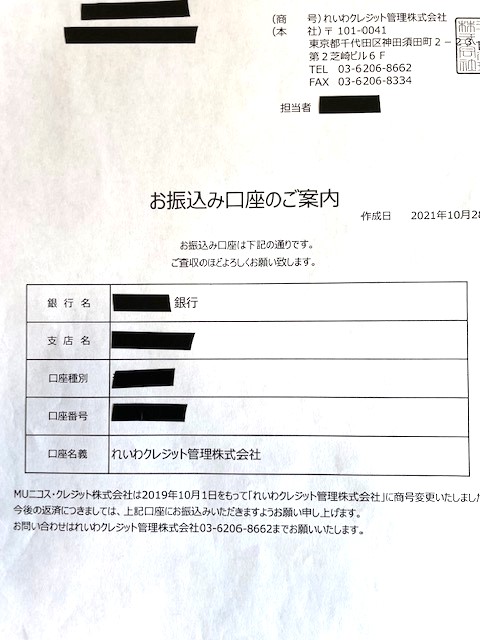 れいわクレジットの「お振込み口座のご案内」時効(132)