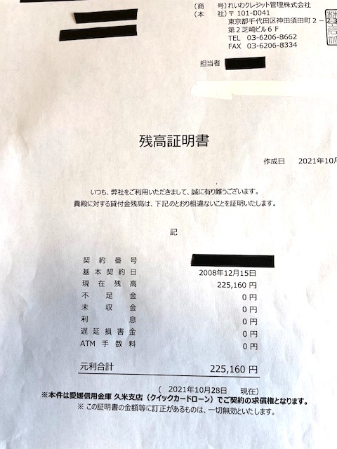 セットになっている残高証明書も「契約番号・契約日・現在残高」くらいしか記載が無く、他の業者なら書かれていることが多い「最終貸付日・約定返済日・期限の利益喪失日・利息や損害金の内訳」などの情報がありません。