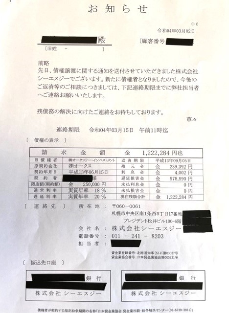 シーエスジーから「お知らせ」という書面が届くことがあります。これは、債権譲渡及び債権譲受通知書という書面が届いた後または同時に送られてくることが多いようです。