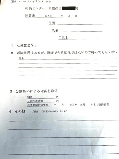 この別紙は返済に対する回答書になっていて、「1返済の意思なし」「2返済意思はあるが、返済できる状態ではないので待ってもらいたい」「3分割払いによる返済を希望」「4その他」となっています。返済意思が無い人は、そもそも別紙は無視すると思いますので、重要なのは2と3です。