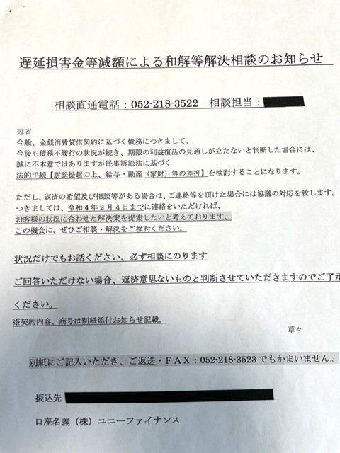 ユニーファイナンスから届く「遅延損害金等減額による和解等解決相談のお知らせ」