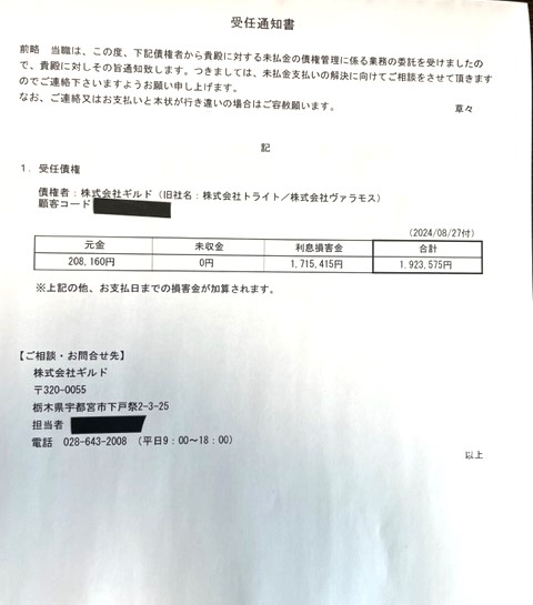 トラスト弁護士法人から受任通知書が届いても、トラスト弁護士法人は通知書の代行をしているだけで交渉の窓口になっている訳ではありません。ですから今までのギルドの通知書と同じと考えるべきです。