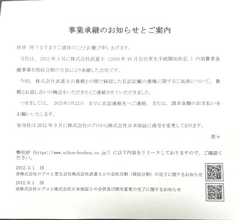 日本保証から「事業承継のお知らせとご案内」という書面が届くことがあります。内容は、倒産した旧武富士の債権を引き継いで請求している会社であること、以前の社名はロプロであること、話し合いたいので連絡して欲しいこと、などが書かれています。